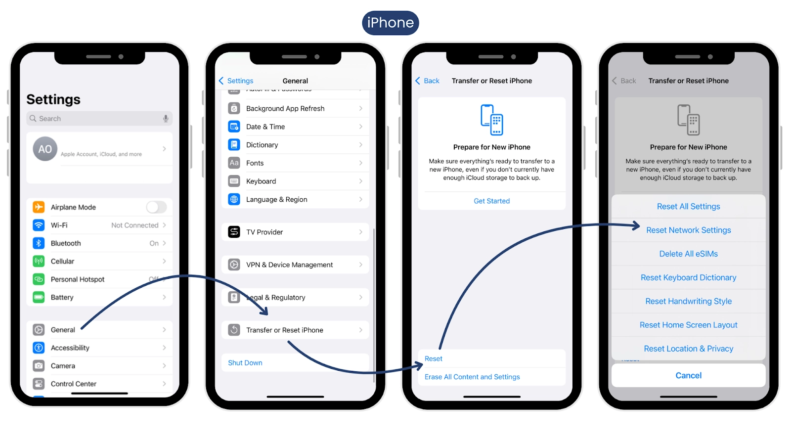 設定 > 一般 > iPhone を転送またはリセット > リセット > ネットワーク設定をリセット